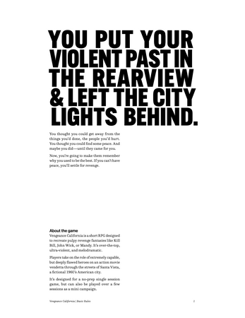 Vengeance California is a short, narrative RPG designed to recreate pulpy revenge fantasies like Kill Bill, John Wick, or Mandy. The Basic Rules contain all of the rules & mechanics from the full game, but in a simplified layout without any art. Purchase the full game here.